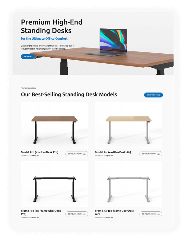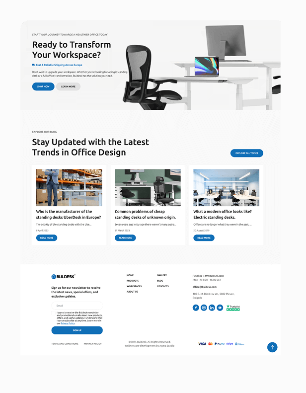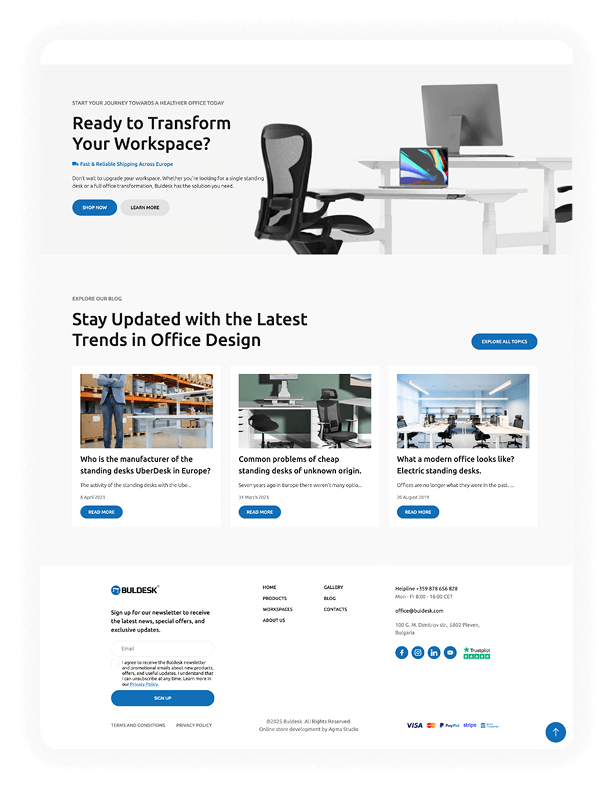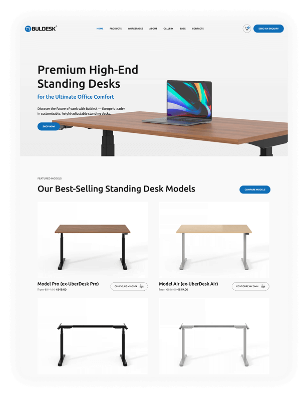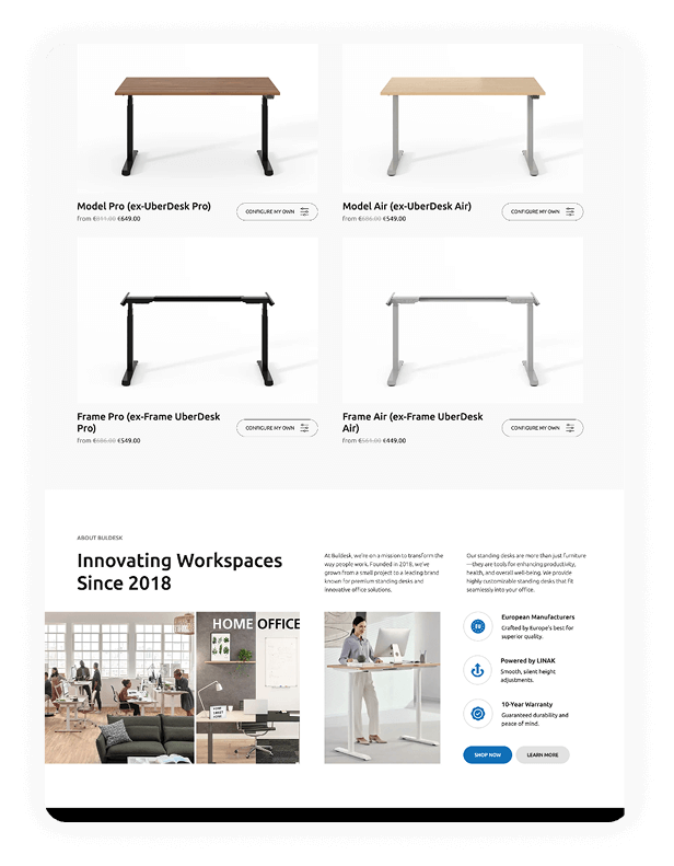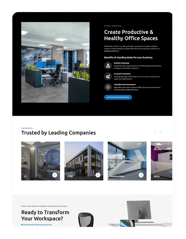 Buldesk е бранд за висок клас ергономични бюра, създадени за здравословна и продуктивна работа. Изградихме модерен онлайн магазин, който отразява функционалността и гъвкавостта на техните продукти.