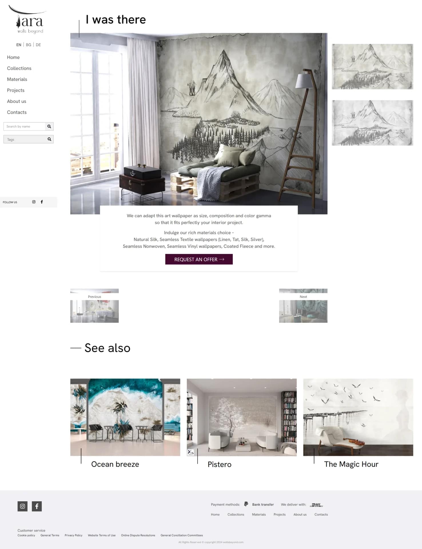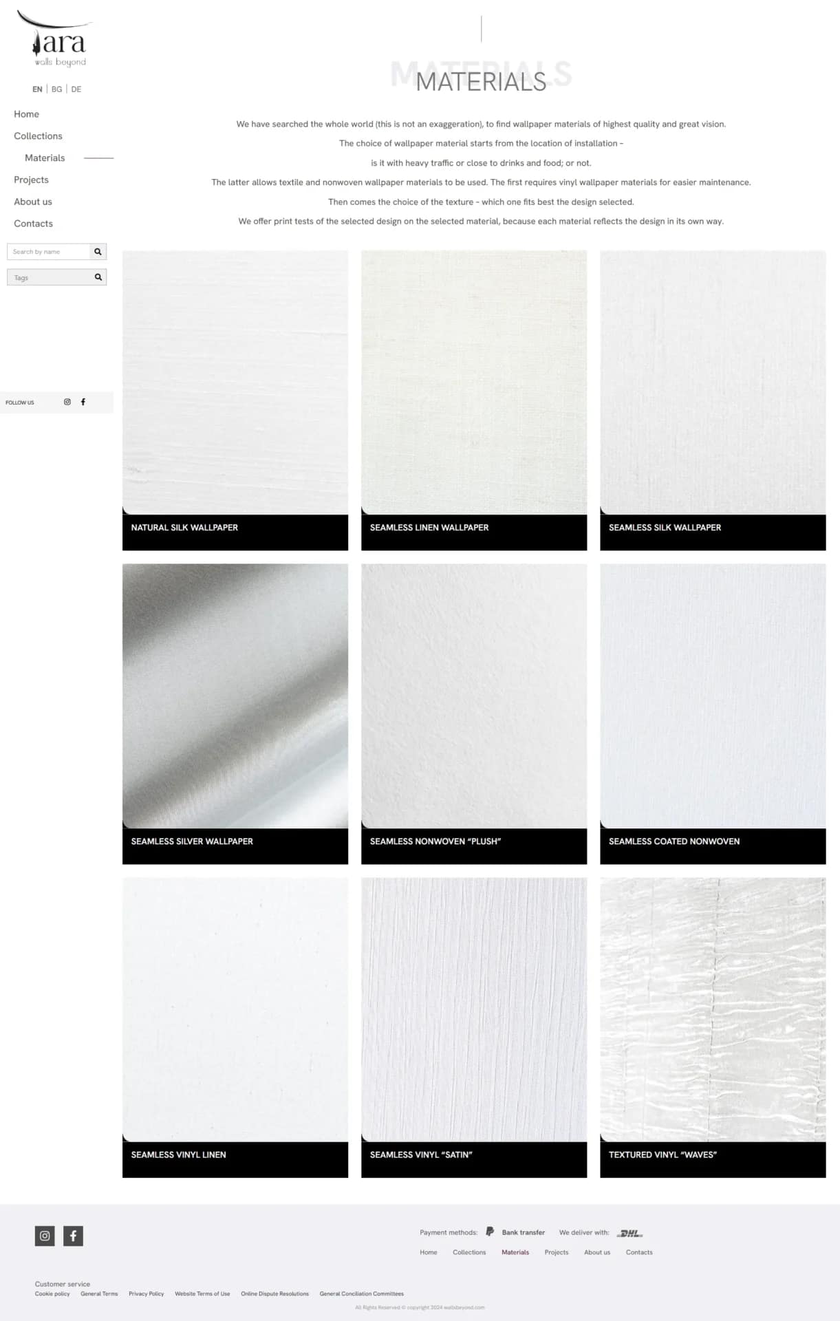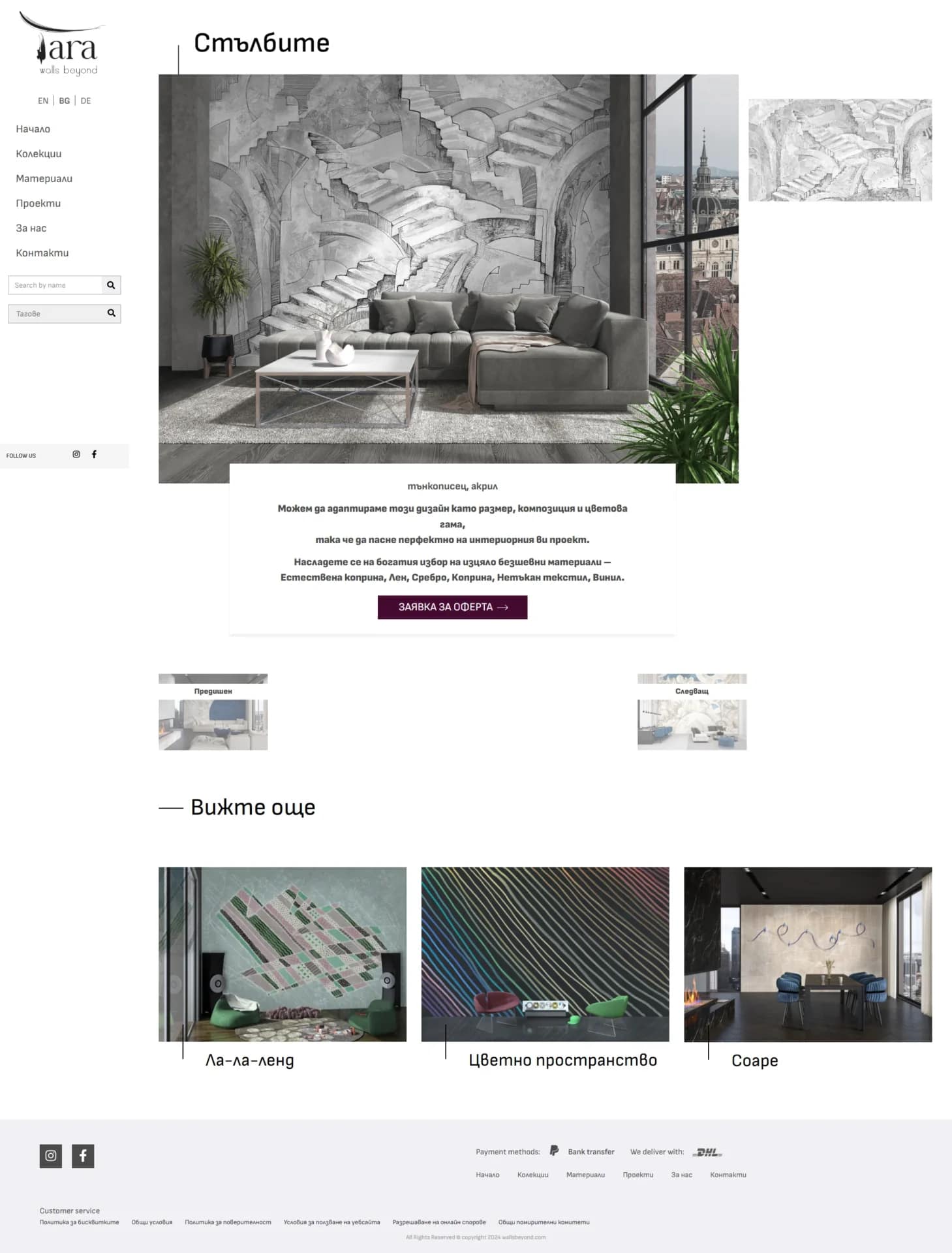Walls Beyond е бранд, който предлага селекция от изключителни материали и дизайн за стени. Нашата мисия беше да изградим онлайн среда, която да отразява класата и качеството на продуктите. Фокусът беше върху безупречно визуално представяне, лесна филтрация по стил/материал и интуитивни инструменти за визуализация.